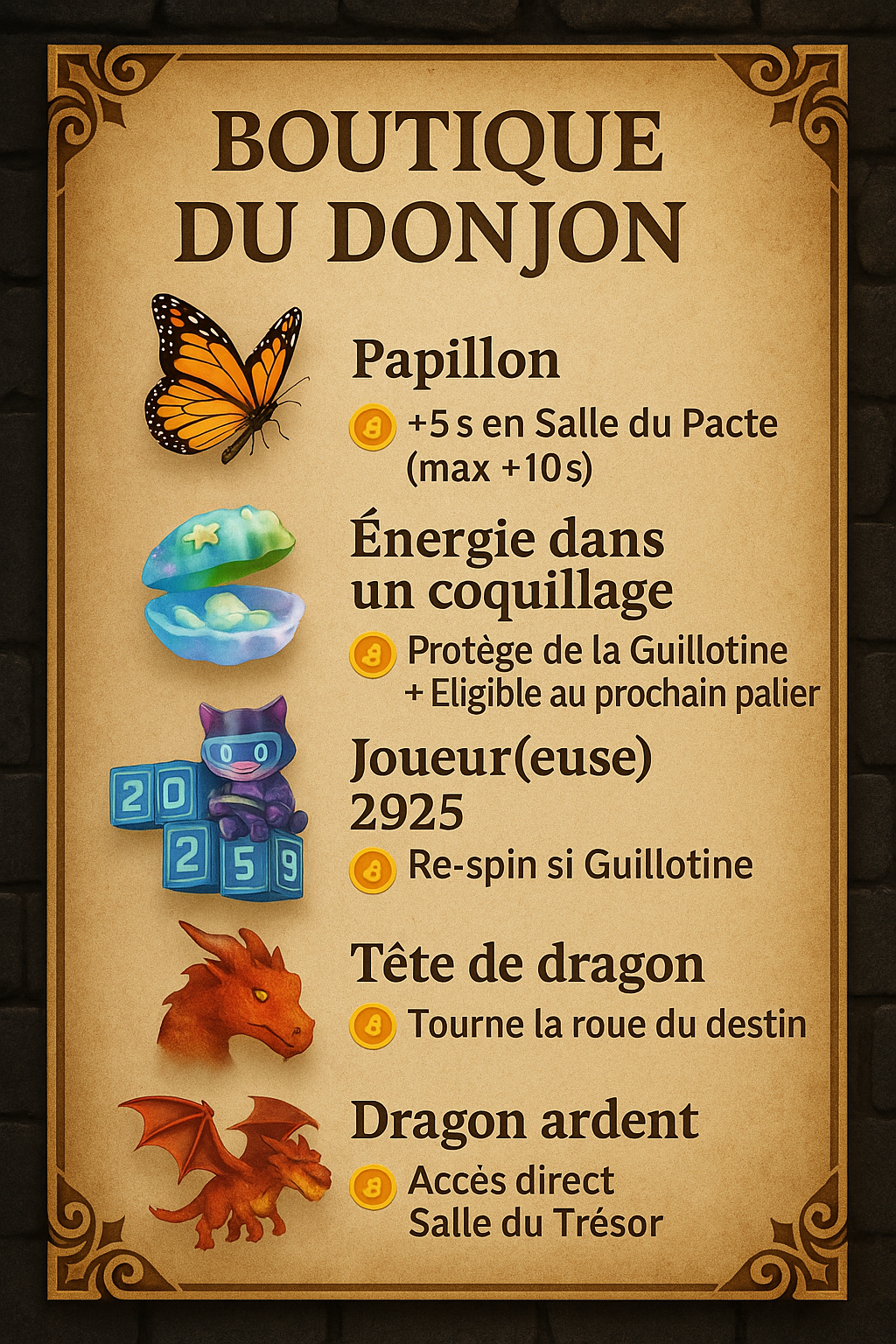 Tu peux acheter une ou plusieurs clés du donjon cela te permettra de faire tourner la roue du destin et de te lancer dans une aventure durant laquelle, si tu arrives à passer mes défis, tu pourras obtenir un trésor pas cinq proposer.